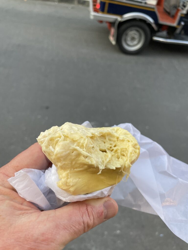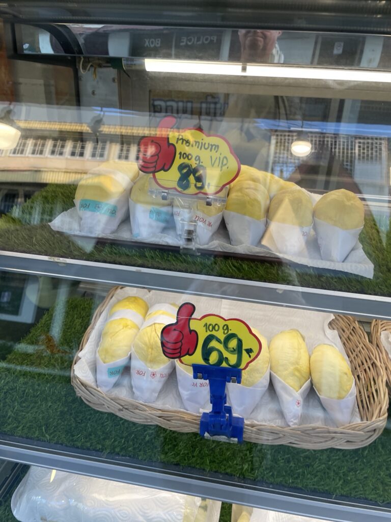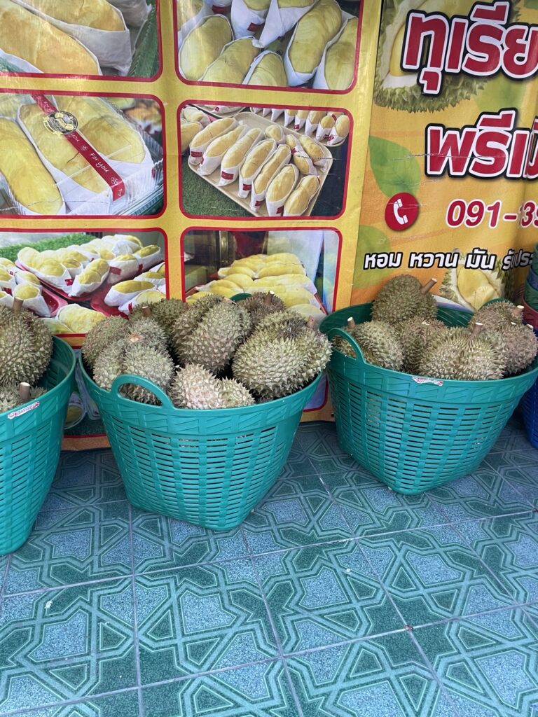 The image features a sign that promotes durian, specifically a variety known as “Monthong” (หมอนทอง), which is a popular and sweet type of durian. The sign highlights its appeal with vibrant graphics of the fruit and its flesh, attracting customers to try this unique delicacy. Durian is often referred to as the “king of fruits” in Southeast Asia due to its distinctive flavor and creamy texture.