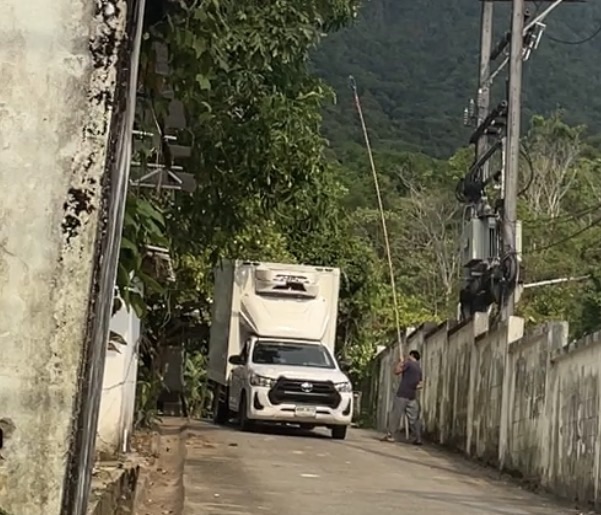 Vage actie met hele lange stok om vruchten ofzo uit boom te tikken. Hoop hilariteit en gelach, vlak voor ik filmpje startte.