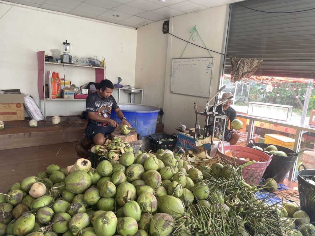 Het strand blijkt na twintig minuten te eindigen bij rotsen waar golven met een hoop geweld op breken. De weg op dus, langs eetstalletjes waar ge-BBQ’ed wordt op houtskoolvuurtjes en waar live een papaya-salade gemaakt wordt.